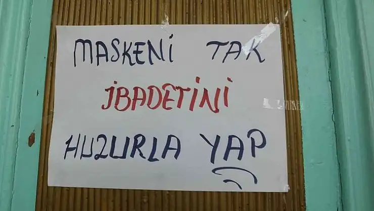 Burhaniye ilçesinde, camilerde sık sık maske ve mesafe uyarısı yapılırken, Şarköy Cami İmamı Yakup Ercan da, cami kapısına 'Maskeni Tak İbadetini Huzurla Yap' diye yazdı. Cemaatin kurallara uyduğunu anlatan Ercan, yazının faydalı olduğunu söyledi.