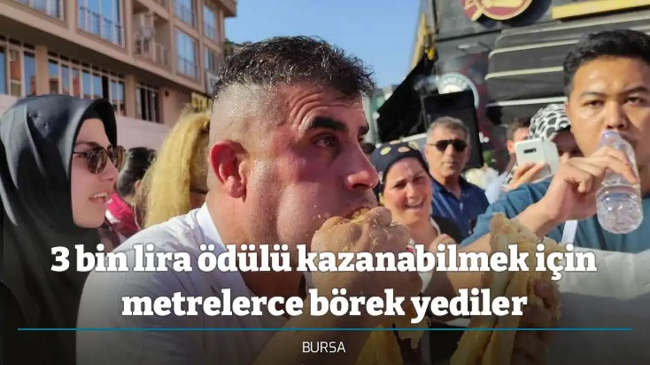 Bursa'da düzenlenen 3 bin lira ödüllü börek yeme yarışmasında yarışmacılar ödülü kazanmak için kıyasıya yarıştı. Birincinin 10 dakika içinde 15 metre 60 santim börek yediği yarışmada renkli görüntüler ortaya çıktı.
