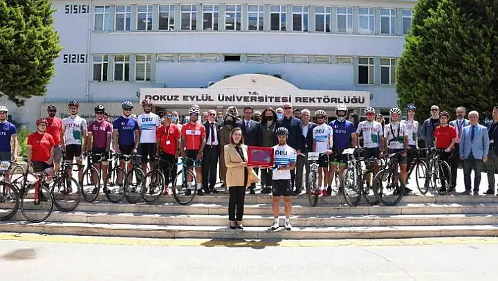 Dokuz Eylül Üniversitesi'nin (DEÜ) İzmir'in kurtuluşunun 100. yıl dönümü etkinlikleri çerçevesinde düzenlediği 'Al Bayrağımızla Geleceğe' isimli bisiklet turuna katılan sporcular, DEÜ Rektörü Prof. Dr. Nükhet Hotar'dan emanet aldıkları şanlı Türk Bayrağını, Buca'daki DEÜ Bayrakbilim ve Türk Bayrakları Müzesine teslim etti.