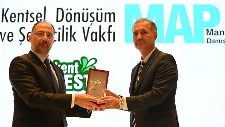 Sunumun ardından Başkan Alper Taban, Kentsel Dönüşüm Projesi ile ilgili ödülü kongreye katılan Çevre ve Şehircilik Bakanlığı Altyapı ve Kentsel Dönüşüm Hizmetleri Genel Müdürü Vedad Gürgen'den aldı.