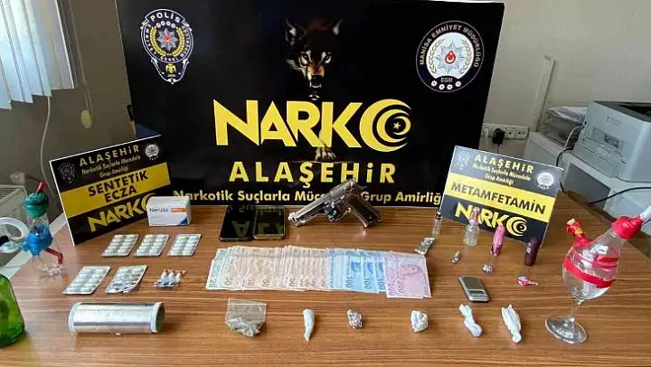 Alaşehir İlçe Emniyet Müdürlüğü Narkotik Suçlarla Mücadele Grup Amirliği görevliler tarafından 'Uyuşturucu Madde Satan, Kullanan ve Nakleden' şahıslara yönelik yapılan çalışmalarda M.K. (28) isimli şahsın ikametinde yapılan aramada, 43 adet 600 mg sentetik ecza hapı, 3 adet 225 mg sentetik ecza hapı, 19.04 gram metamfetamin, 6.76 gram esrar, 1.50 gram kenevir tohumu, 1 adet çalışır vaziyette hassas terazi, 4 adet uyuşturucu içme aparatı, 1 adet metamfetamin fişeklerde kullanılan alüminyum folyo ve 1 adet tabanca ele geçirildi. M.K. poliste yapılan sorgusundan sonra çıkarıldığı mahkeme tarafından tutuklandı.