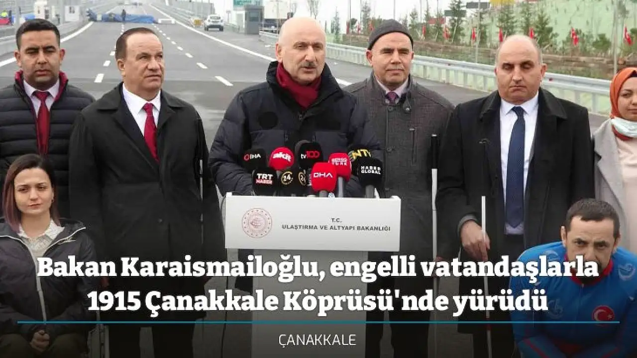 Ulaştırma ve Altyapı Bakanı Adil Karaismailoğlu, yarın Cumhurbaşkanı Recep Tayyip Erdoğan'ın katılımıyla açılışı yapılacak olan 1915 Çanakkale Köprüsü'nde, Türkiye'nin farklı illerinden gelen görme ve bedensel engelli vatandaşlarla köprünün ortasına kadar yürüdü.