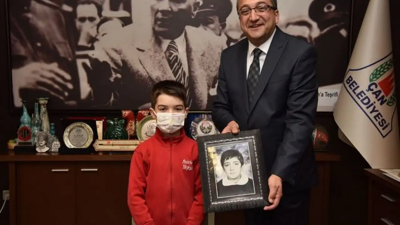 Okul Müdürü Turhan Çokgezer ve öğretmeni İsmail Demir ile Çan Belediyesi’ne gelen küçük öğrenci Çan Belediye Başkanı Bülent Öz’ün ilkokul 1 sınıftaki siyah beyaz fotoğrafını Başkan Öz’e hediye etti. Daha sonra koltuğa oturan küçük öğrenci birim müdürlerini çağırarak okulda eksik gördüğü malzemeleri tamamlama talimatı verdi. Başkan Öz, “Büyük Önder Mustafa Kemal Atatürk’ün çocuklara armağan ettiği "23 Nisan Ulusal Egemenlik ve Çocuk Bayramı" kutlamaları çerçevesinde, hayallerinin peşinden giden Hamza Yaşar evladımız, bugün makam koltuğundaydı. Talepleri, soruları ve hayalleri ile günümüze renk, yüzümüze sevinç katan evladımız, gelecek nesillere ilkokula olan güvenimizi de tazeliyor adeta ilkokul sıralarında çekilmiş anlamlı bir fotoğrafımı hediye eden ve beni o günlere götüren, Atatürk İlkokulu Müdürü Turhan Çokgezer ve 2/B sınıf öğretmeni İsmail Demir’e çok teşekkür ediyorum. Bugünün çocukları yarının geleceği olacak küçük öğrencimizin taleplerini arkadaşlarımız aldı. En Kısa zamanda öğrencimizin taleplerini yerine getireceğiz. Bugünü hatıra kılacak, yarın için bizleri gururlandıracak çocuklarımızın 23 Nisan Ulusal Egemenlik ve Çocuk Bayramı kutlu olsun” dedi.