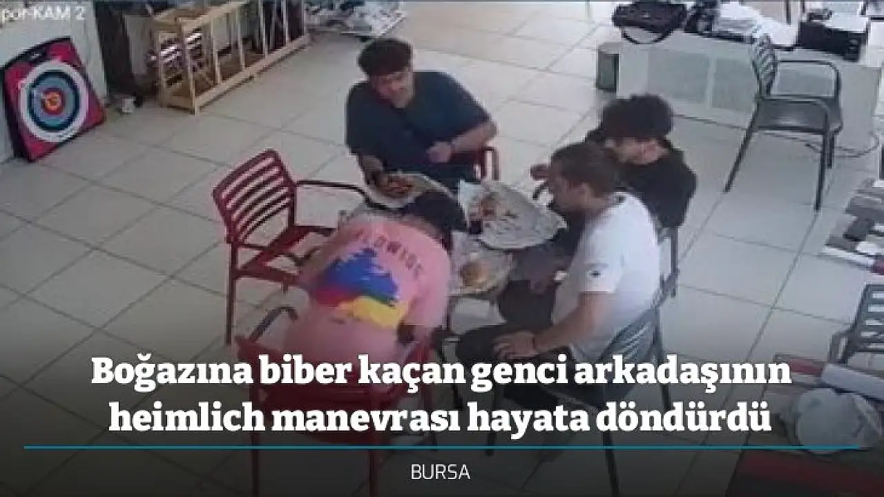 Olay, merkez Yıldırım ilçesinde bulunan Erikli Mahallesi’nde meydana geldi. Bir restoranda yemek yiyen 4 arkadaş korku dolu dakikalar yaşadı. Masada bulunan gençlerden biri yemek yediği sırada nefes borusuna biber kaçtı. Nefes alamayan gencin kafası masaya düşünce arkadaşları da ne yapacağını şaşırdı. Kısa süreli paniğin ardından arkadaşlarından biri, heimlich manevrasıyla boğazına kaçan biberi çıkardı. Müdahalenin ardından tekrar nefes almaya başlayan arkadaşları gence sarılarak yüzüne su döktü.