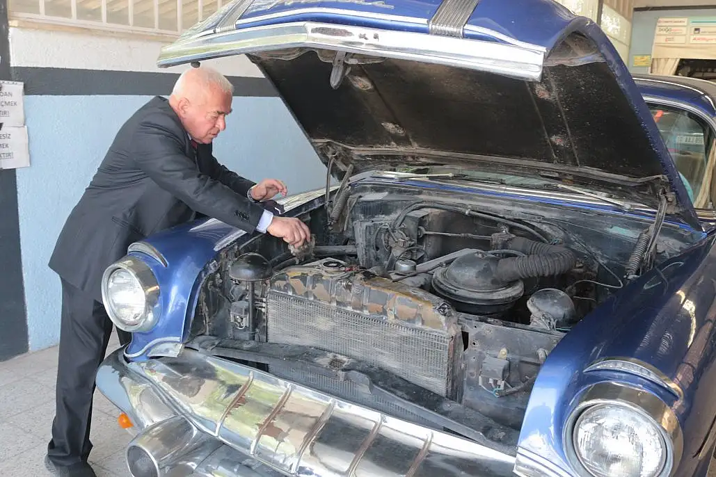 1965 yılından bu yana küçük sanayi sitesinde kaportacılıkla uğraşan Nedim Eyigören, kendisine ustası tarafından emanet edilen 1956 model Pontiac marka arabaya gözü gibi bakıyor.
