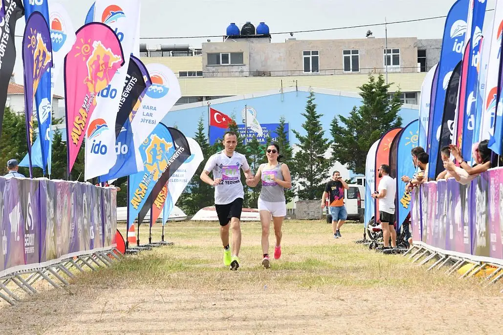 Balıkesir Avşa Yarı Maratonu'nda 300'den fazla yerli ve yabancı sporcu 'Temiz Denize Doğru Koşuyoruz' sloganıyla Marmara Denizi'ne koşarak sıfır atık konusuna dikkat çekti.