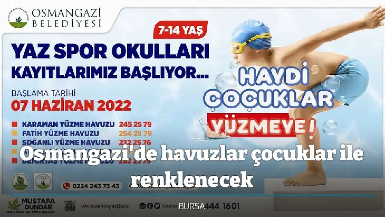 Osmangazi Belediyesi, hayata geçirdiği Yaz Spor Okulları ile bu yıl da binlerce çocuğa sporu sevdirecek. Osmangazili çocukların sabırsızlıkla beklediği Yaz Spor Okulları’nın 2021-2022 döneminde havuzlar, yeni kulaçlar ile renklenecek. 7 Haziran Salı günü başlayacak yüzme kurslarından yararlanmak isteyen 7 ve 14 yaş arası çocuklar hafta içi 2, hafta sonu 3 haftalık programlar halinde eğitim alabilecek.