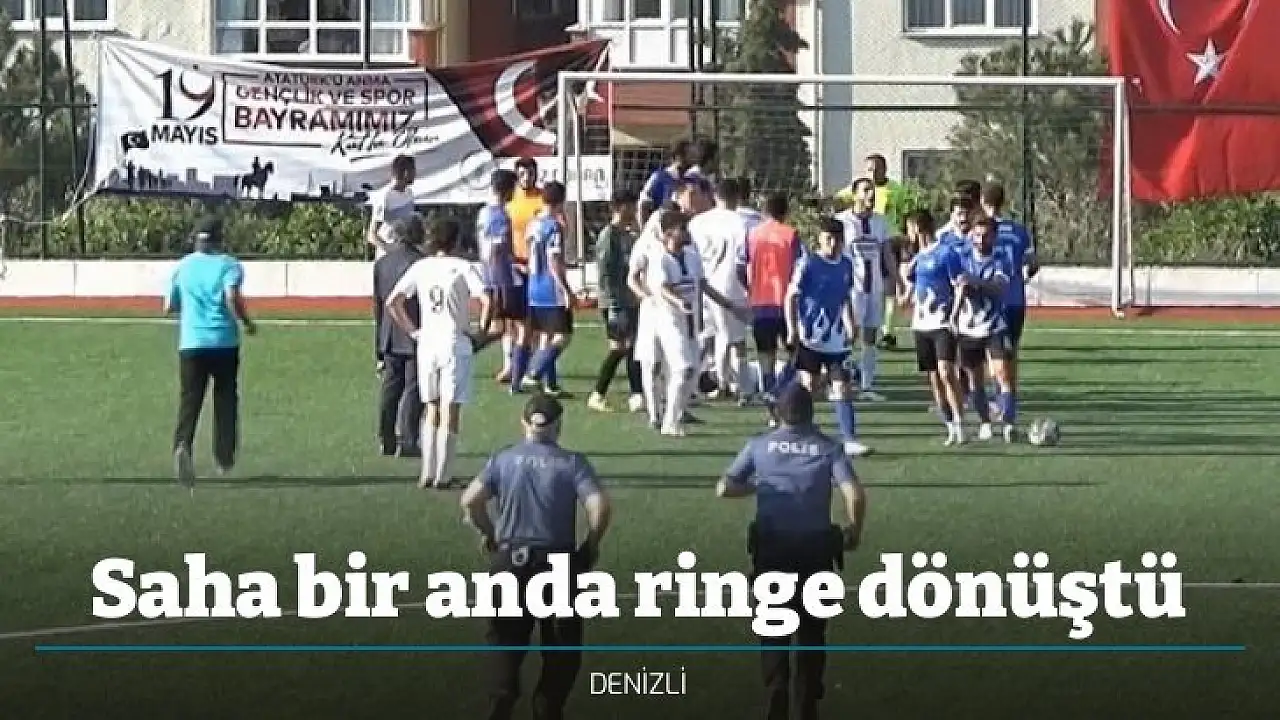 DENİZLİ (İHA) – Denizli'de oynanan amatör küme maçında, yapılan sert müdahalenin ardından saha bir anda ringe dönüştü. Her iki takımın futbolcu ve teknik heyetlerinin tekme tokat kavga ettiği olaya, sahaya giren güvenlik güçleri müdahale etti.