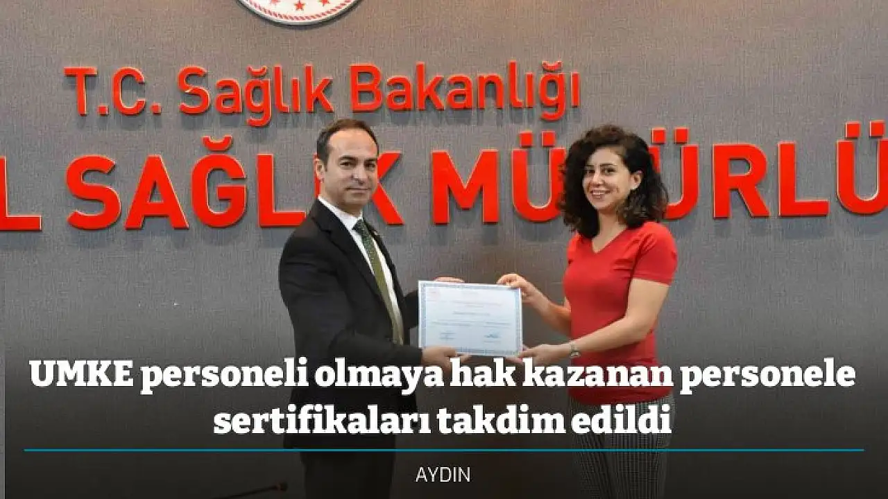 Aydın İl Sağlık Müdürlüğü Sağlık Hizmetleri Başkanlığı Afetlerde Sağlık Hizmetleri Birimi tarafından düzenlenen Temel UMKE Eğitimi'ni tamamlayarak UMKE personeli olmaya hak kazanan 24 katılımcıya sertifikaları düzenlenen tören ile takdim edildi.