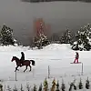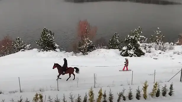 Uludağ'ın eteklerinde bir binicilik merkezinde atlı snowboard yapılmaya başlandı. At binme ve snowboard sporlarını bir araya getiren bu faaliyet havadan drone ile görüntülendi. Bir at tarafından çekilen snowboardçu, yokuş yukarı ve düz zeminde kayak yapmanın da keyfini çıkartıyor.